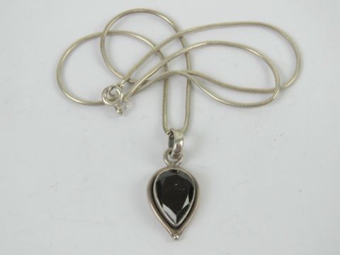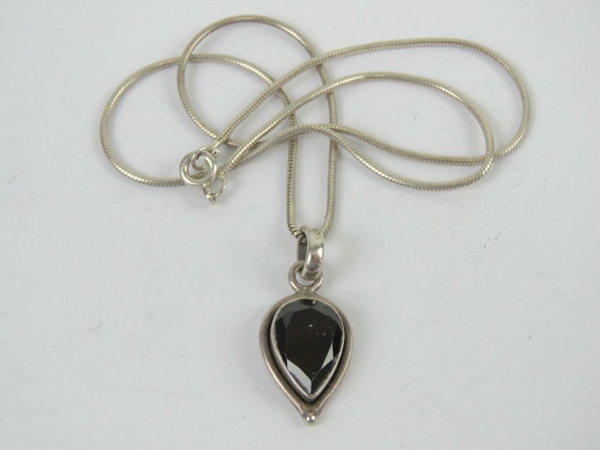 A teardrop shaped garnet pendant, stamped 925 on a 925 silver snake link articulated chain, pendant 3.2cm inc bale.
