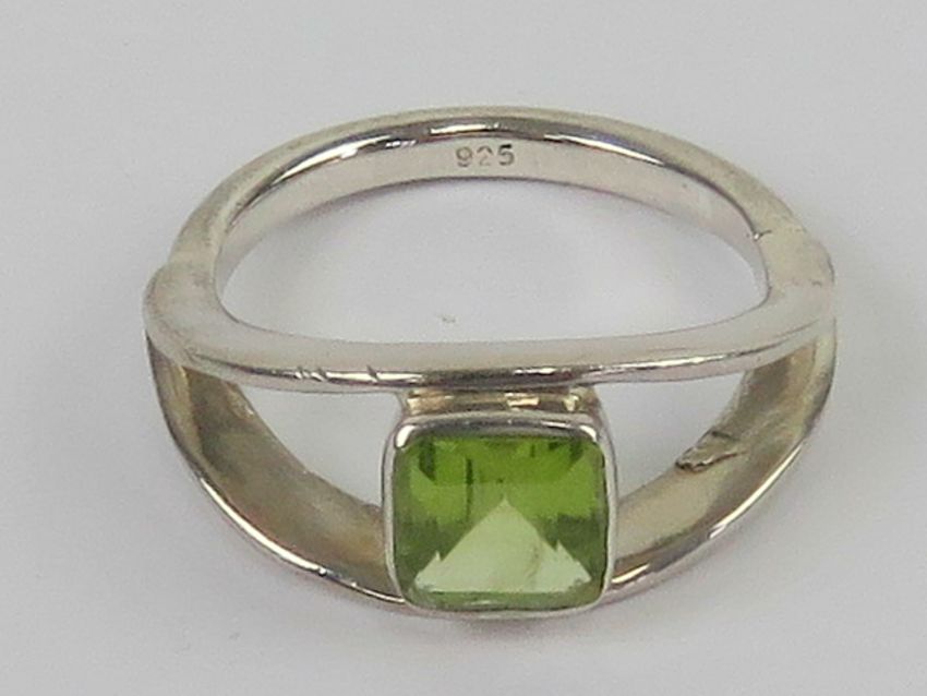 A silver and square faceted peridot ring, approx 0.9ct, stamped 925, size N.