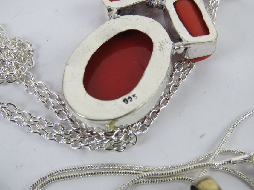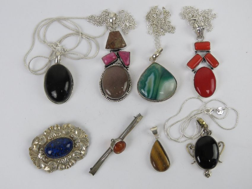A quantity of assorted hard stone jewellery including onyx pendants and tigers eye pendant, also a baltic amber white metal brooch.