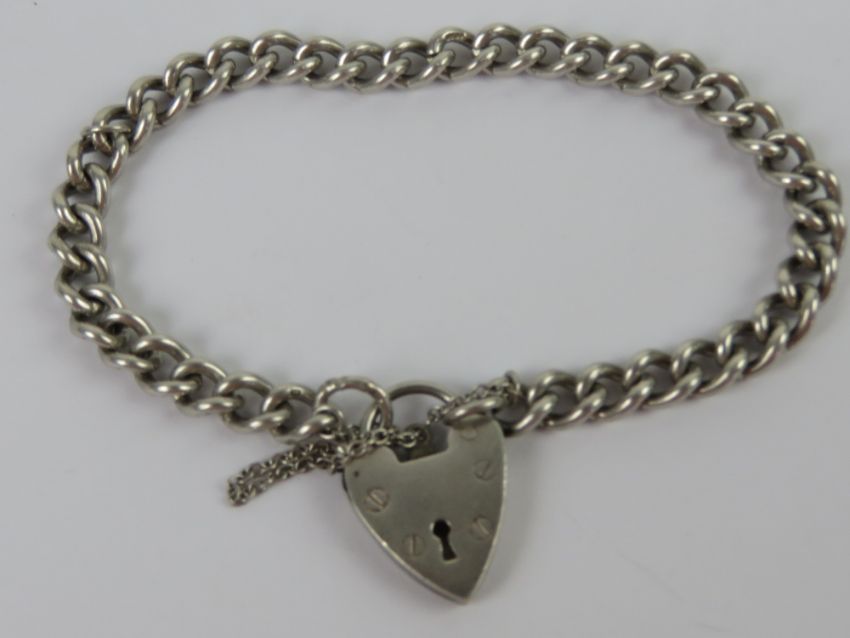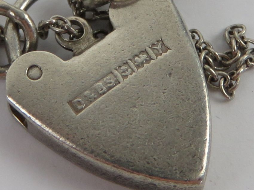 A HM silver curb link chain charm bracelet having heart padlock clasp, hallmarked to the chain and clasp, 15.6g