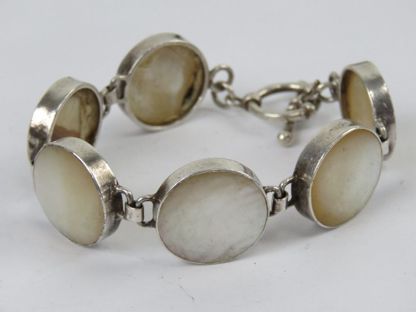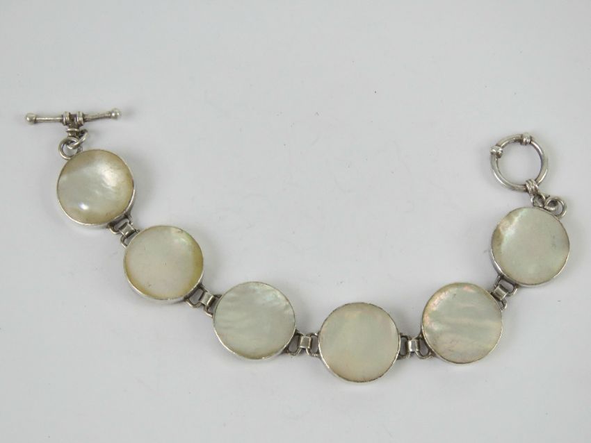 A mother of pearl bracelet having T-bar clasp, no apparent hallmarks, 20cm in length.
