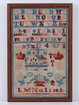 A late 19th century needlepoint sampler, framed, bearing alphabet and numbers and entitled 'Sweet Home', undated signed L McCulloch, 13 x 19cm.