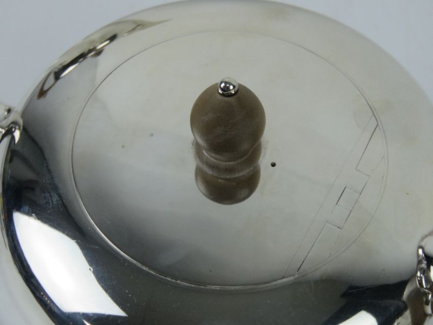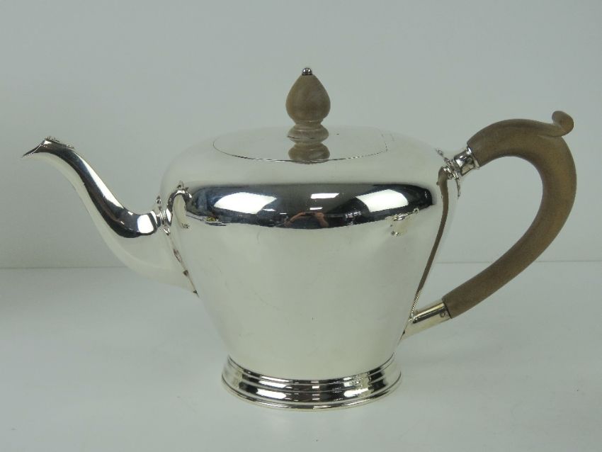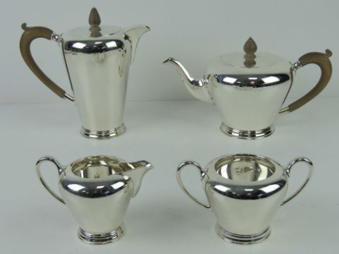 An Art Deco HM silver four piece tea service comprising teapot and coffee pot with wooden handles and finials, twin handled sugar bowl and milk jug. Each piece hallmarked for London 1925-26 with maker's mark for Edward Barnard & Sons Ltd, having retailer's mark Windsor Bishop, Norwich. Total weight 52.51ozt / 1636g.