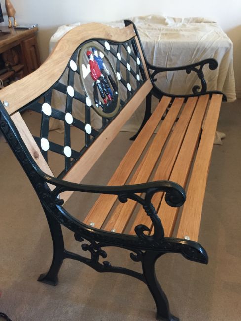 A Golf themed West Sussex Oak and cast metal framed garden bench, having Berkley Forge plate upon, treated with Osmo oil and finished in beeswax, 50" long, 27" deep and seat height is 16". Sold in absentia customer to collect from Chichester.