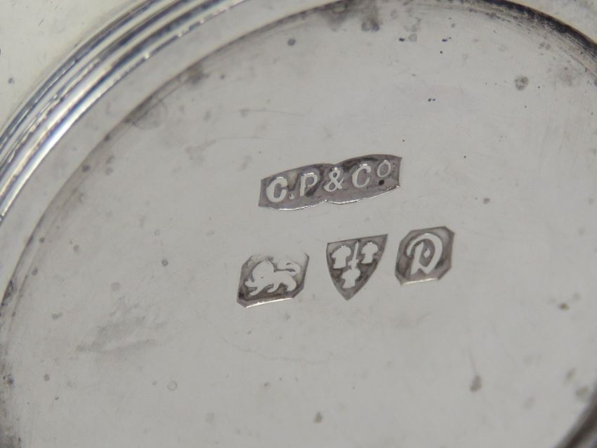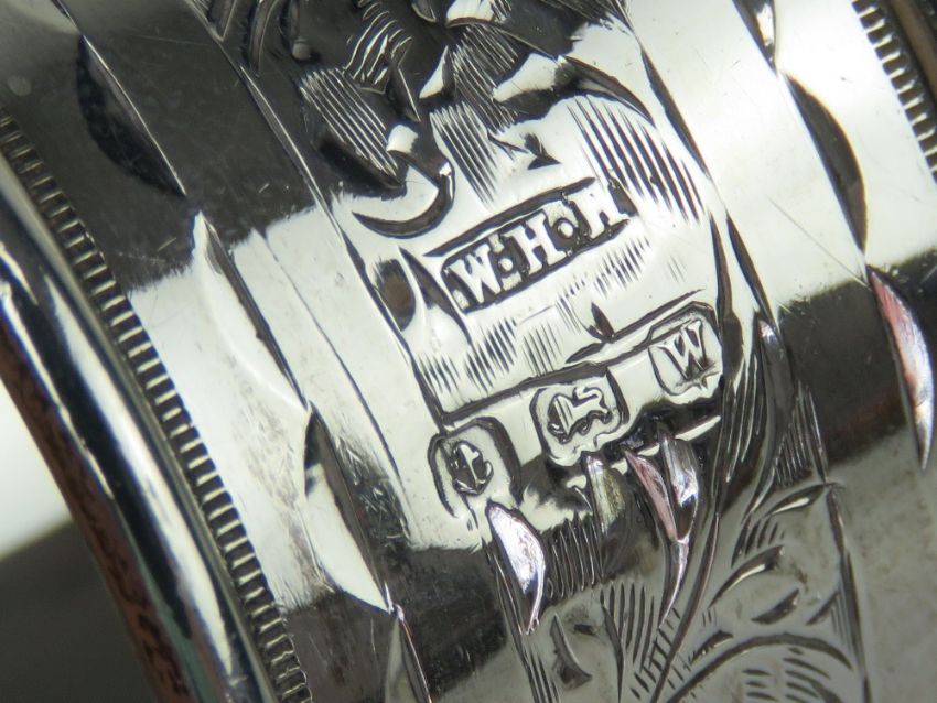A Mappin & Webb HM silver tea strainer, together with an HM silver pepperette having Chester hallmark, an HM silver salt with Bristol blue glass liner and an HM silver napkin ring. Four items, total silver weight 3.8ozt/118.1g.