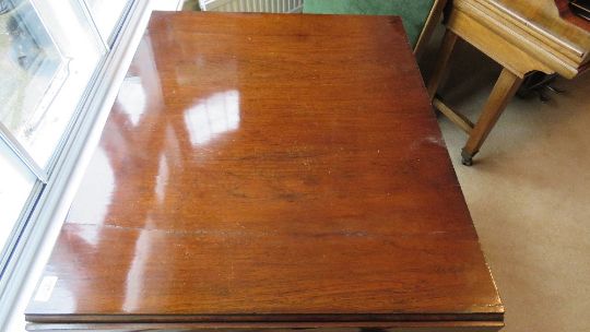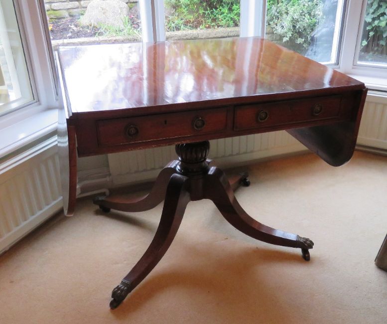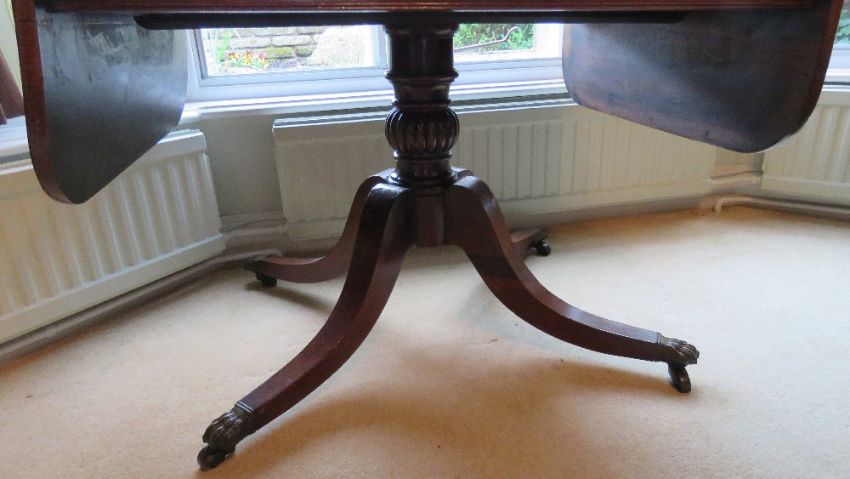 An early 20th century mahogany Georgian style drop leaf table raised over quatreform base terminating in brass lions paw castors, 152 x 71 x 70cm. Twin drawers and opposing dummies, a/f to top.