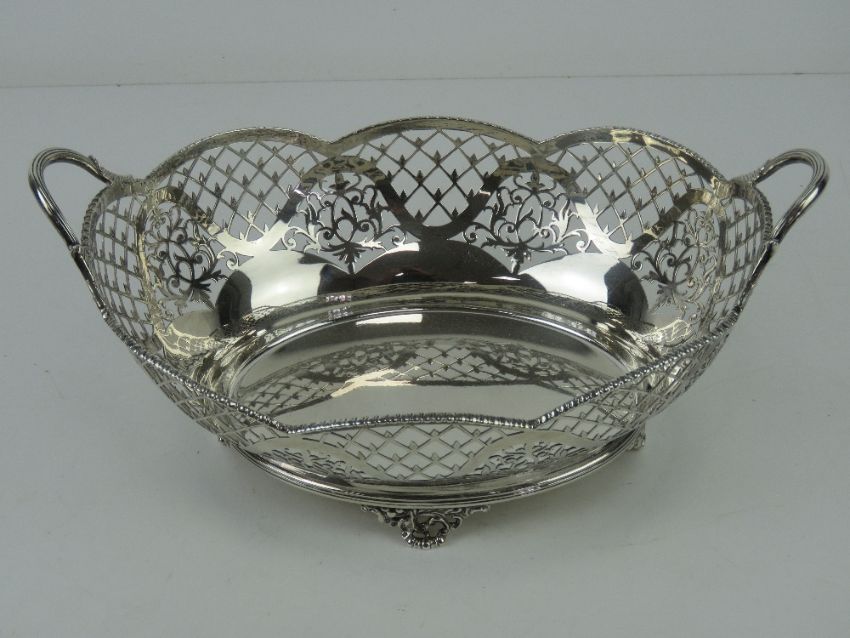 A HM silver twin handled fruit bowl having pierced decoration and raised over four floral feet, hallmarked for Sheffield 1918 with maker's mark for William Hutton & Sons Ltd, having further mark upon and numbered 31626, 27.5 x 18 x 12.5cm, 14.94ozt / 465g.