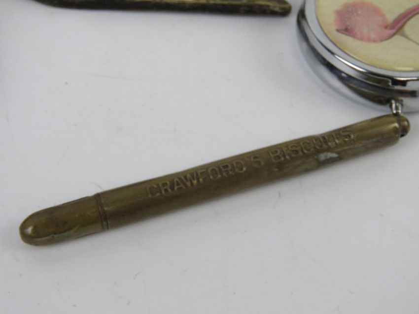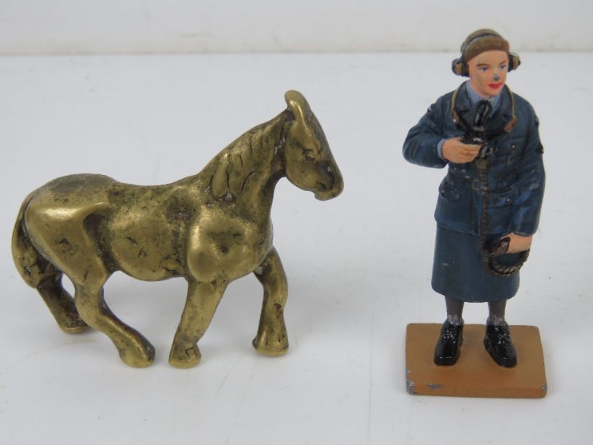A quantity of assorted collectables including a Marmite ink blotter, collapsible horn tot cup, a/f, brass horse figurine, brass cased 'Crawfords Biscuits' pencil, retractable chatelain pencil, commemorative coin, wooden trinket box, a Del Prado leading Aircraftwoman figurine, etc.