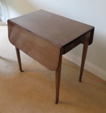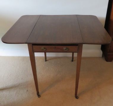 An Edwardian mahogany drop leaf table raised over square tapering legs terminating in roller castors, 96 x 72 x71cm. Single end drawer.