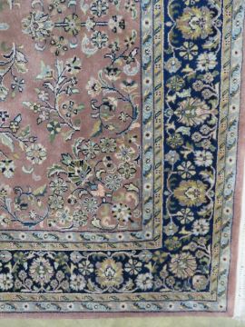 A woollen and silk blush pink ground rug with geometric decoration upon, measuring 242 x 166cm.