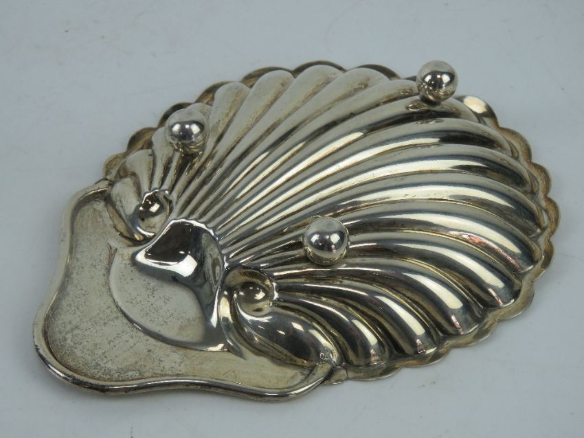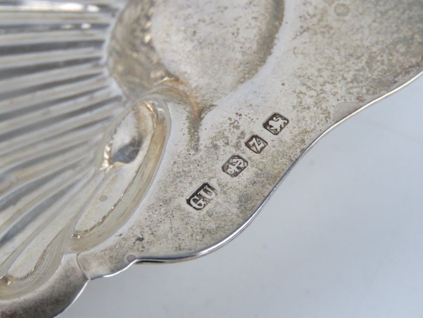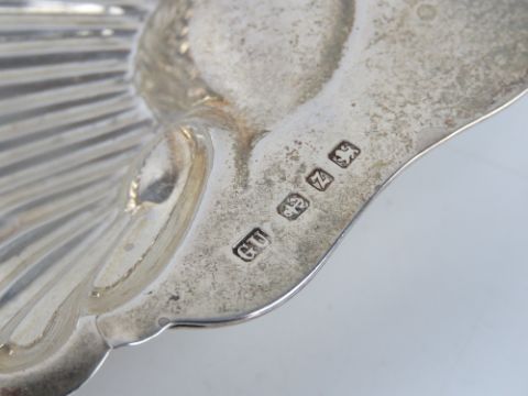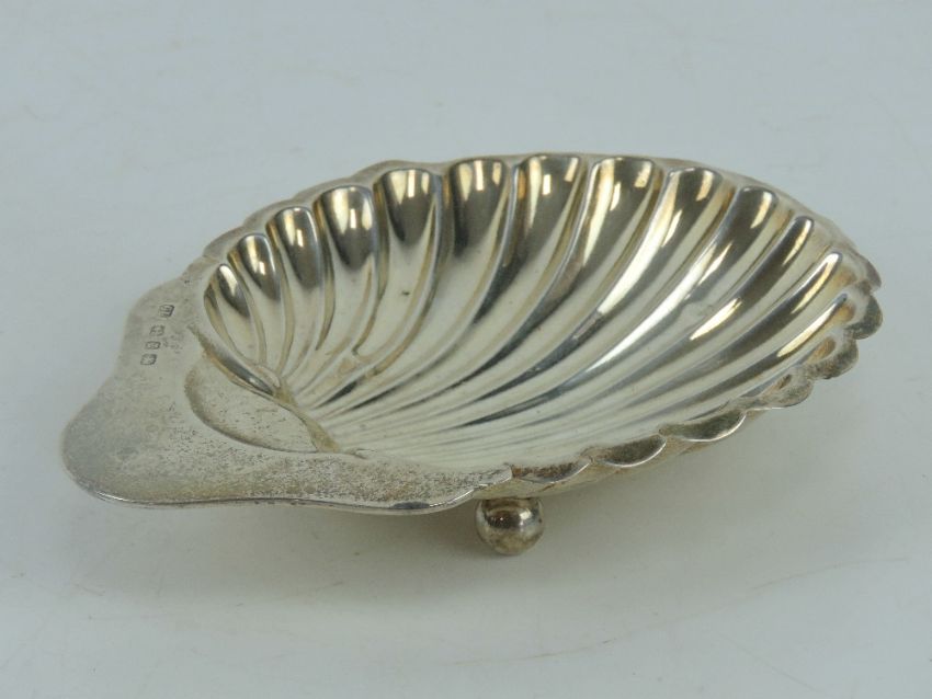 A George Unite HM silver card dish in the form of a clam shell, hallmarked for Birmingham 1899 with maker's mark for George Unite, slightly a/f small split to each side, 2ozt/61.7g.