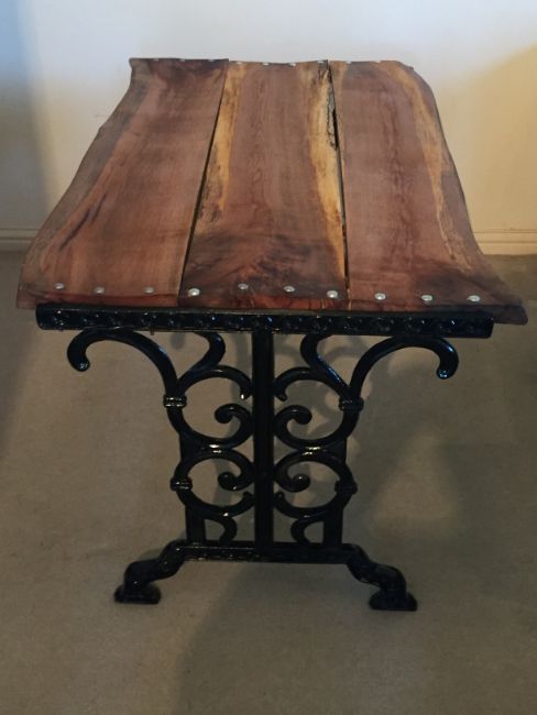 A West Sussex Oak and cast metal framed garden table, treated with Osmo oil and finished in beeswax, 4ft long, 26" deep. Sold in absentia customer to collect from Chichester.