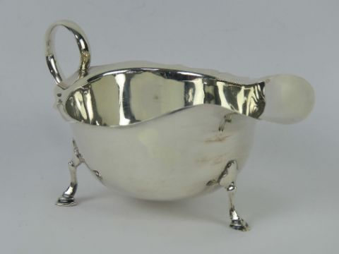 An HM silver sauce boat raised over three hoof feet, hallmarked Birmingham 1927, 3.04ozt/94.4g.