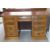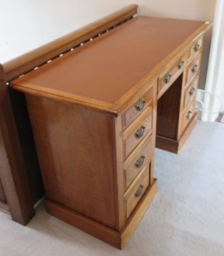 An early 20th century light mahogany kneehole writing desk, plain leather inset surface, central frieze drawer flanked by four graduating drawers to each side, 55 x 130 x 80.