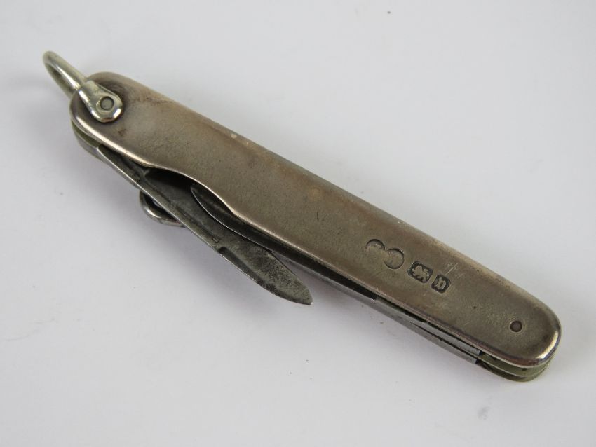 A delightful HM silver ladies pocket tool including fruit knife, secondary knife and button hook, including chatelaine loop. 13cm in length when open. Hallmarked Sheffield 1913.