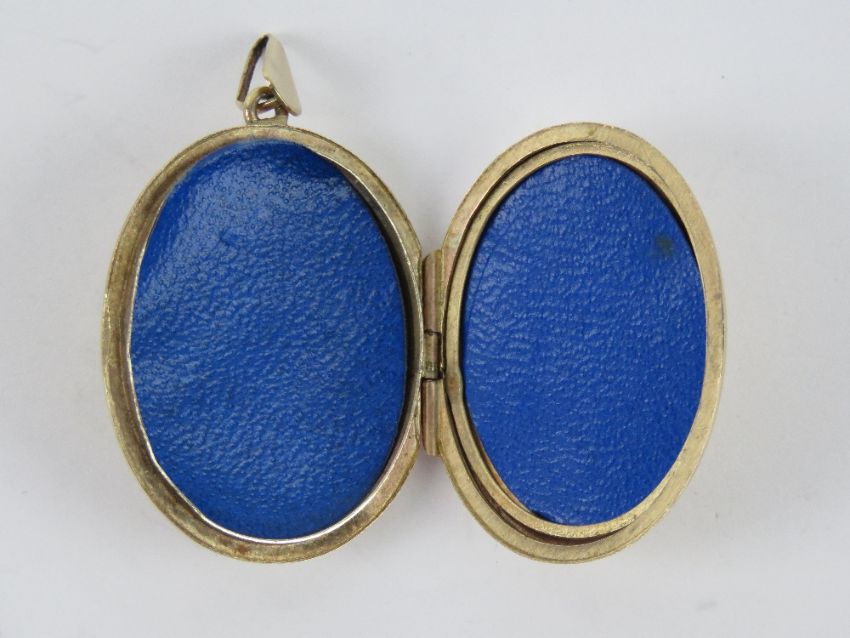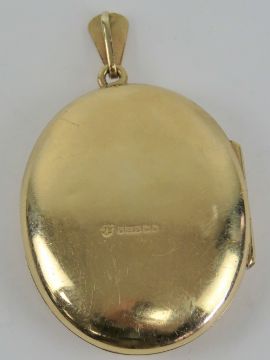 A large 9ct gold locket having floral engraving to front, 4.4cm in length inc bale, hallmarked 375, total weight 9.2g.