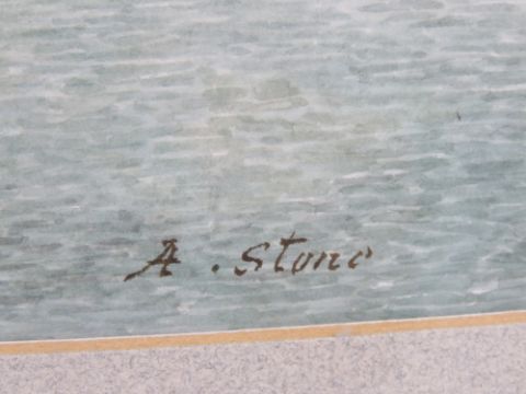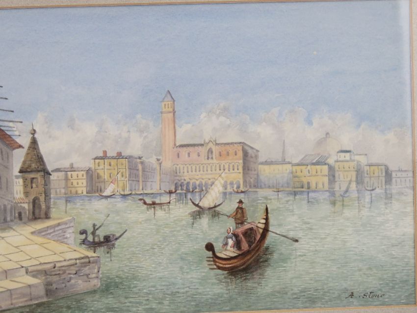 Watercolour; view across the water to the Doge's Palace in Venice, signed lower right by A. Stone, 22 x 47cm.