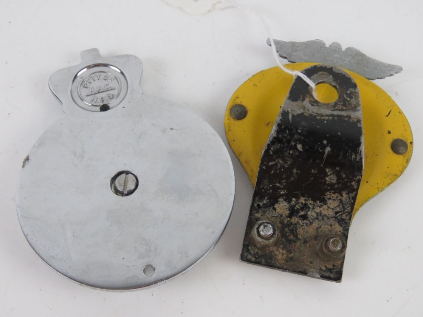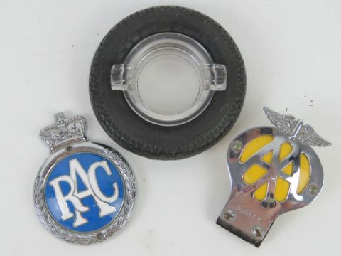 An AA car badge number 35851Y together with an RAC car badge and a 'Firestone Tyre' smoker's receptacle. Three items.