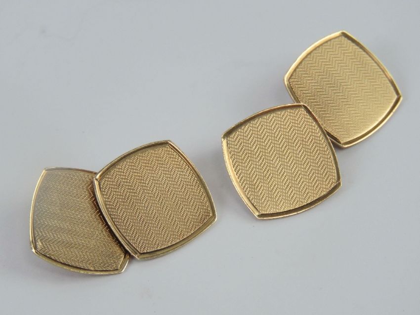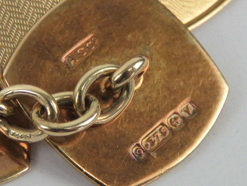A pair of 9ct gold cuff links having engine turned engraved pattern to front and back within fitted case and hallmarked for Birmingham. 4.9g.