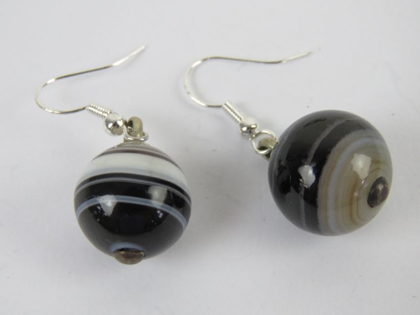 A pair of Victorian banded agate beads having new 925 silver earring hangers, 4cm drop.