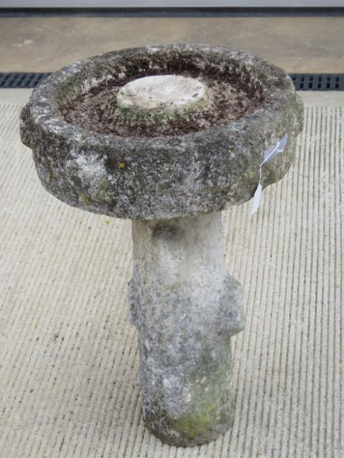 A two sectional stoneware bird bath. Basin 41cm dia, raised over a tree effect pillar all standing 63cm high.