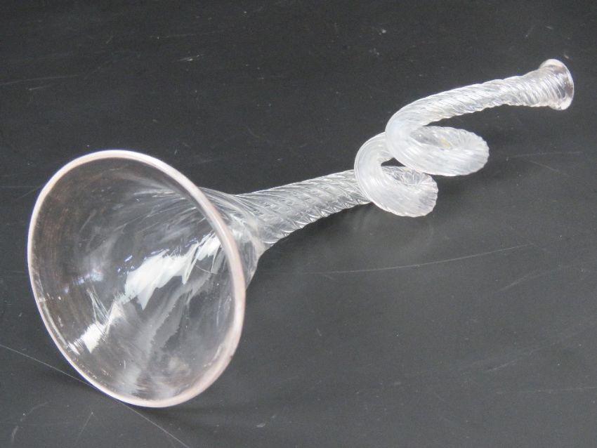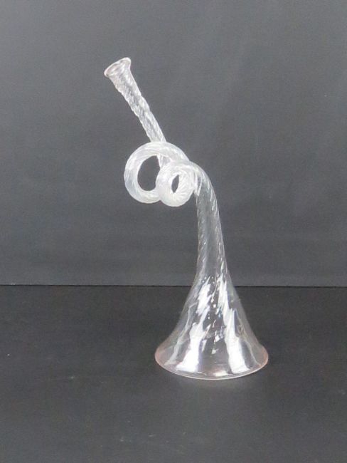 A single hand blown double spiral Edwardian glass dinner horn standing 20cm high in fully working order.