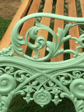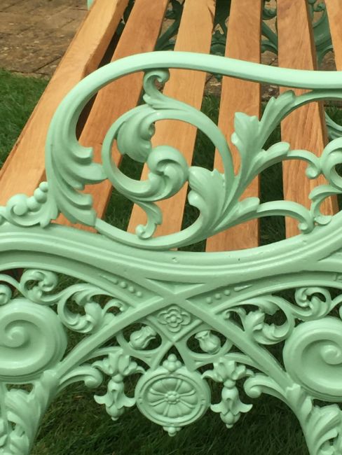 A pair of Victorian Carron Works cast iron garden bench ends, powder coated light mint green, restored with West Sussex Oak slats treated with Osmo oil and finished in beeswax, 50" long, 28" from front to back feet, seat is 17" high, total height 33". Sold in absentia, customer to collect from Banbury. Footnote: The famous Scottish company of Carron was founded in 1759 specialising in 'Cannons, stoves and gates'.