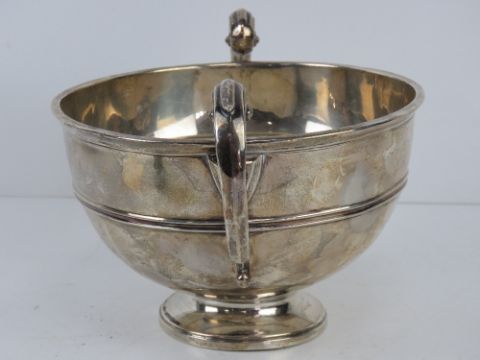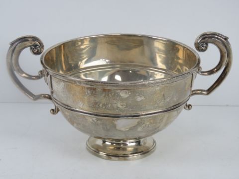 An HM silver pedestal bowl having twin handles and raised over single foot, hallmarked London 1906 with maker's mark for Horace Woodward & Co Ltd, 22.5cm wide, 10.58ozt/328.9g. Slightly a/f.