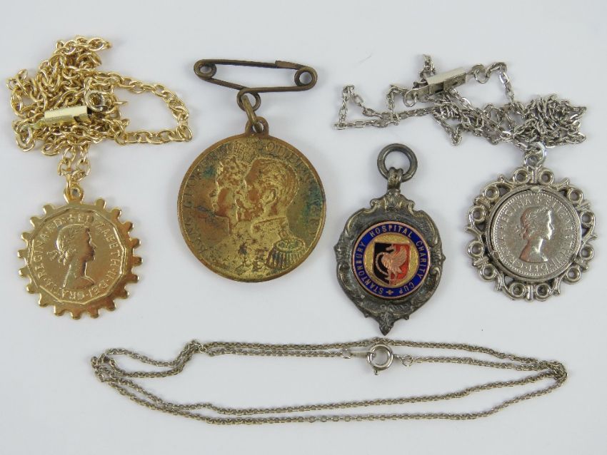 A HM silver Stantonbury Hospital Charity Cup medallion, hallmarked for Birmingham, 12.8g, together with two 'coin' pendants and a George V Coronation medallion.