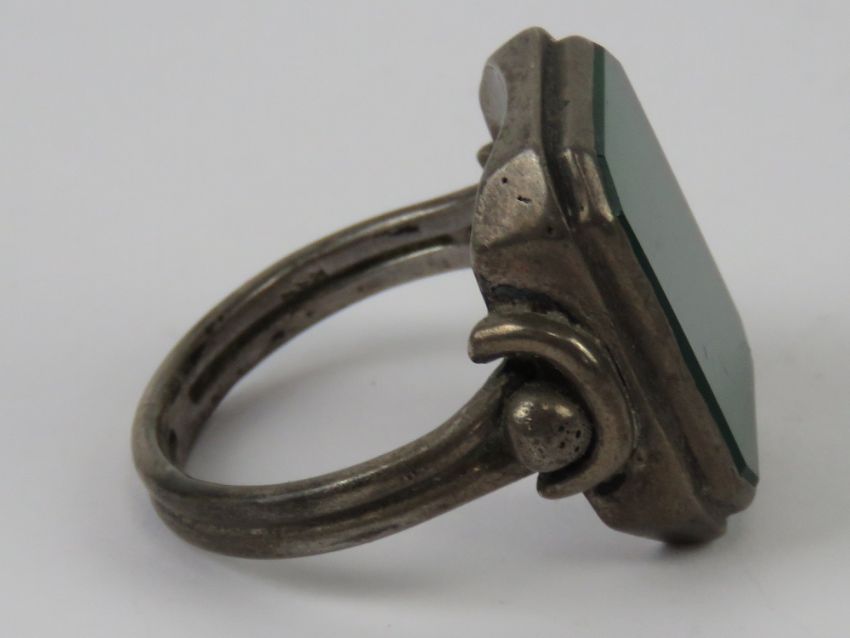 An Art Deco green onyx signet ring, unengraved, no apparent hallmarks, size U.