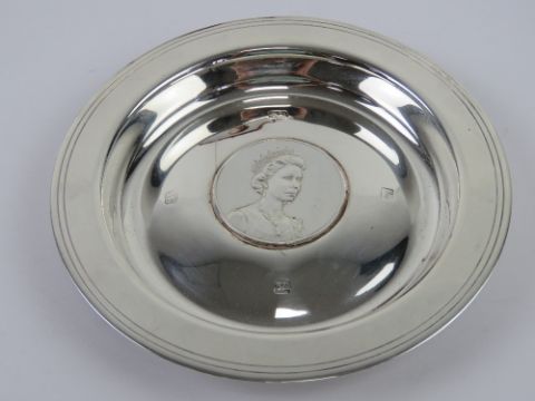 A commemorative HM silver 'Armada' dish for Queen Elizabeth II Silver Wedding Anniversary, hallmarked London 1972 and weighing 4.09ozt/130.2g. In original presentation box.