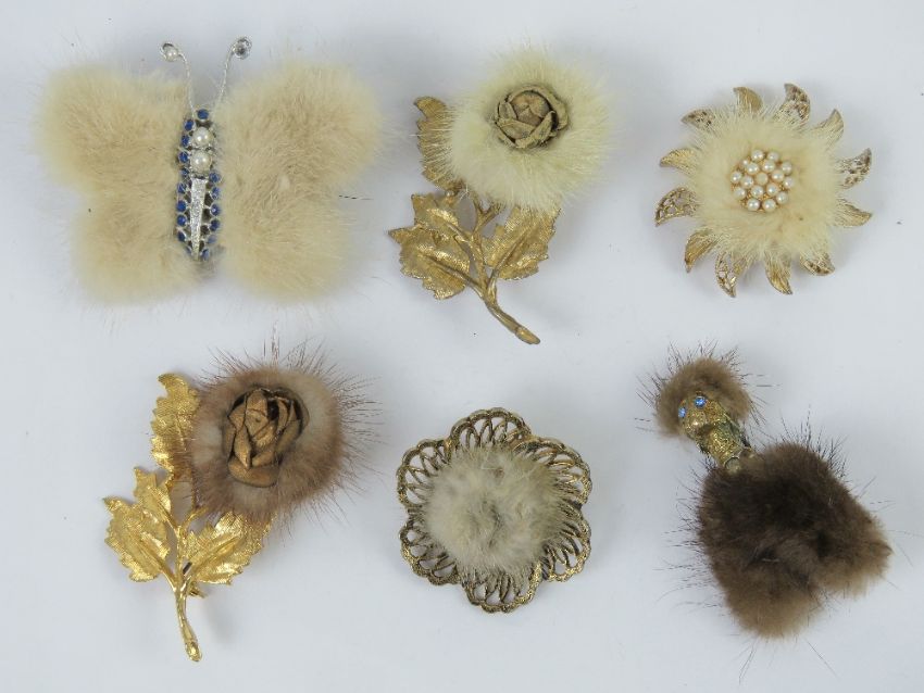 Six early 20th century fur brooches in the form of a dog, a butterfly and flowers.