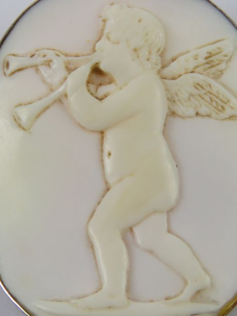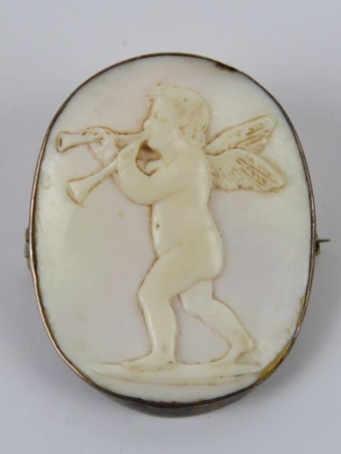 An 'angel skin' coral carved cameo in the form of a cherub playing a musical instrument, set in white metal brooch mount, measuring 3.5 x 2.9cm.