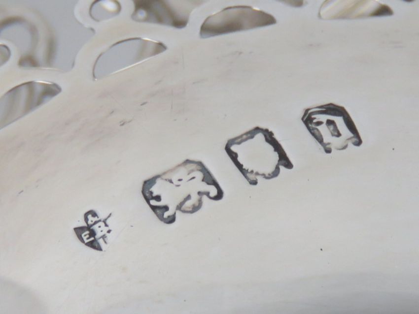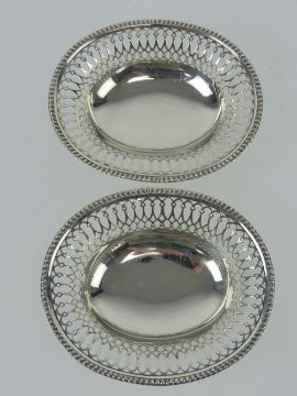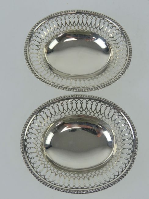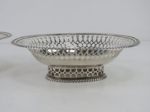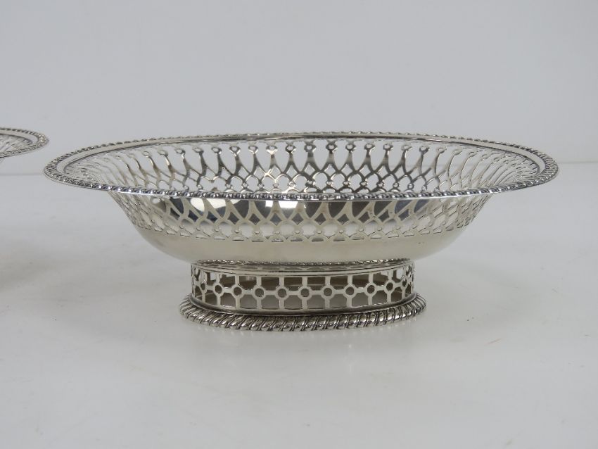 A pair of Victorian HM silver bonbon dishes having pierced decoration to rim and to single footed base, hallmarked London 1859 with maker's mark of Edward Barnard & Sons Ltd, each measuring 17.5 x 15cm. Total weight 8.81ozt / 275g.