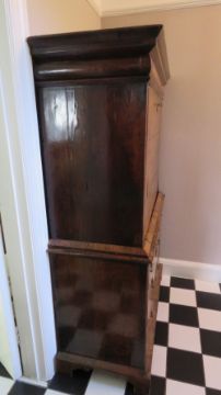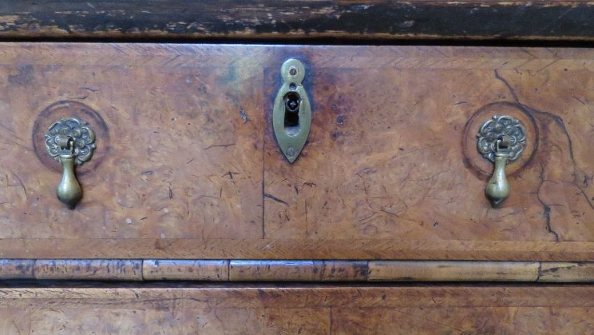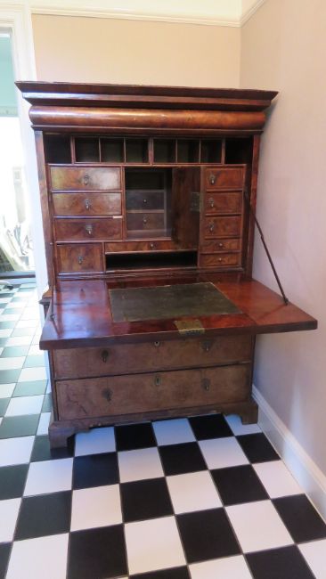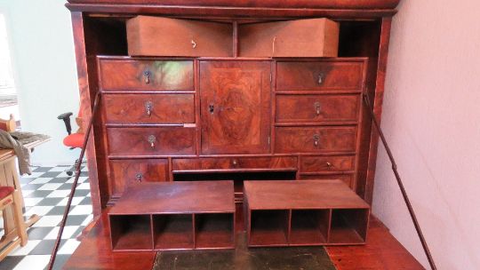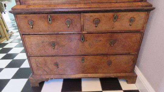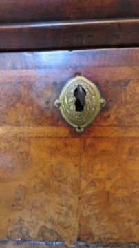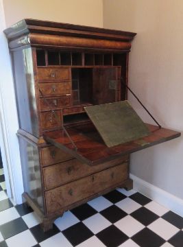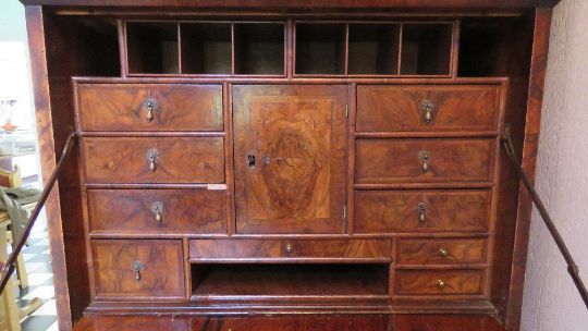 A superb walnut secretaire on chest having fine quality walnut cross banded fall front opening to reveal part leather easel writing surface before, central door opening to reveal twin hided drawers behind, flanked by various drawers, Pigeon holes over having further secret drawers behind. Two short drawers over two long drawers all with original lock escutcheon plates and replacement brass teardrop handles, all raised over bracket feet. 166cm high x 108cm wide, x 51cm deep.
