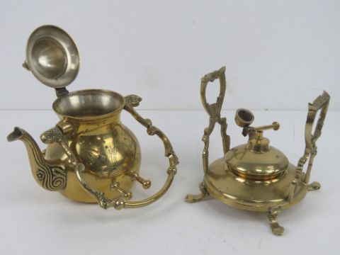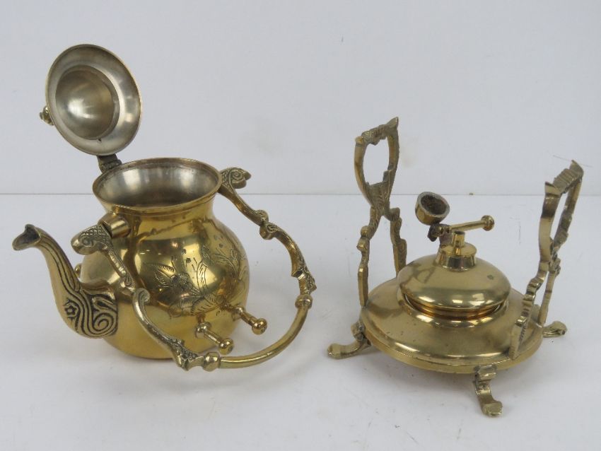A brass teapot with spirit burner and stand all standing 31cm high.