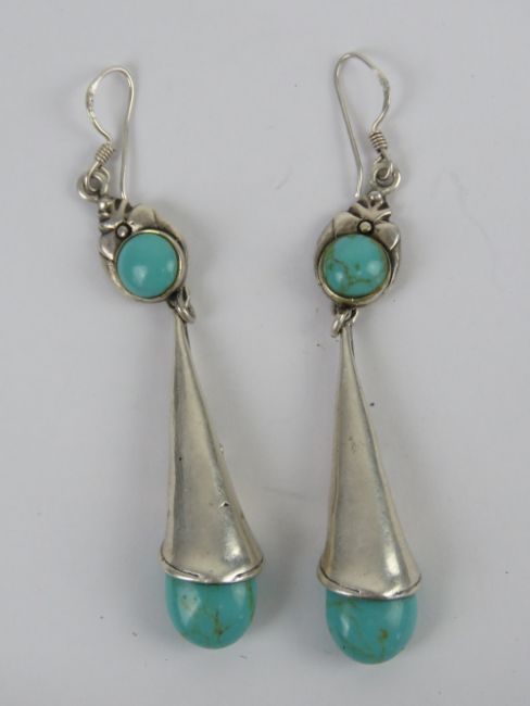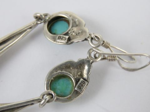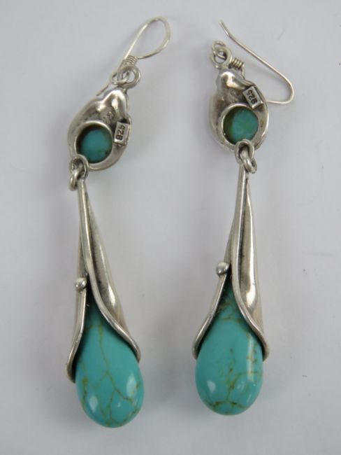 A pair of silver and turquoise earrings in the Art Nouveau style, stamped 925, 8cm drop.