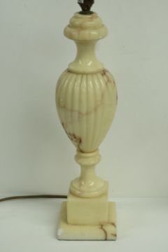Two alabaster side lamp bases of classical baluster form, measuring 45cm not inc fitting and 30cm not including fitting. Shades deficient.
