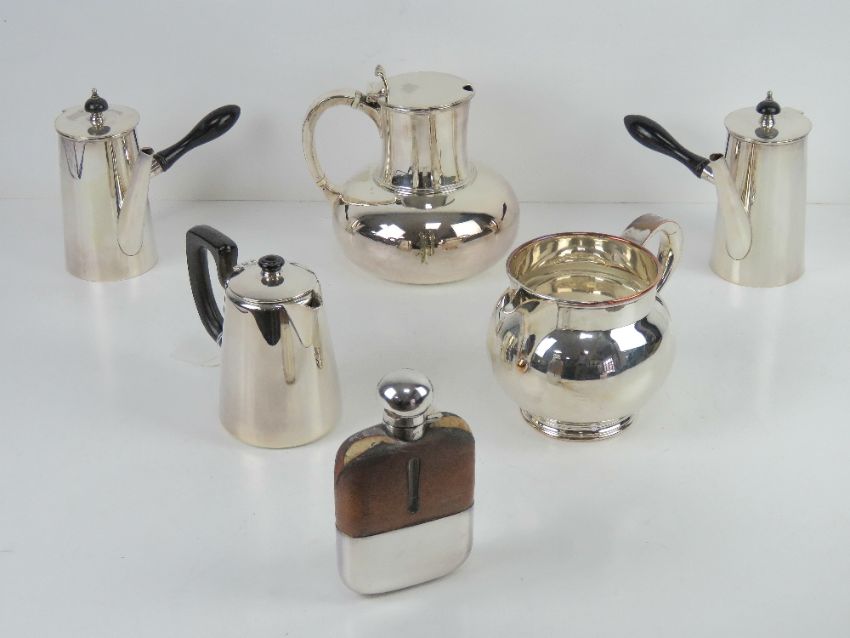 A pair of opposing silver plated hot chocolate pots with ebonised handles, together with a hot water pot, a silver plated lidded carafe, a silver plated pouring jug, and a silver plated hip flask.
