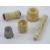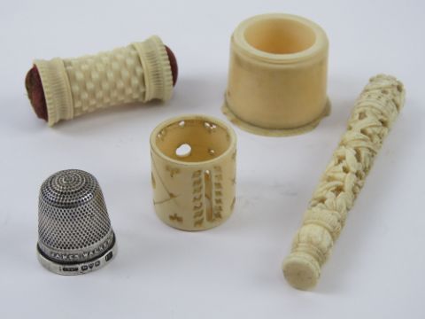 A carved bone needle case having fine bird and foliate design, 8.3cm in length. Together with a silver thimble having Chester hallmark and James Walker makers mark. Also a celluloid tape measure with pin cushion ends (a/f tape deficent), and two other items. Five items.
