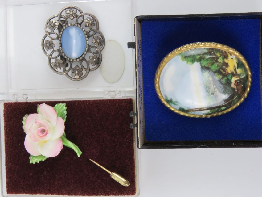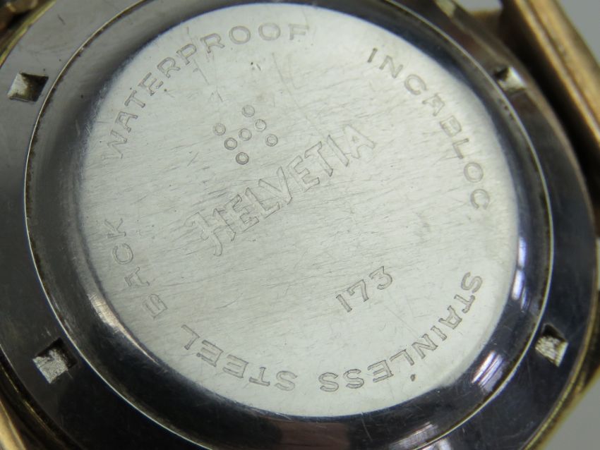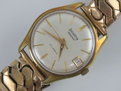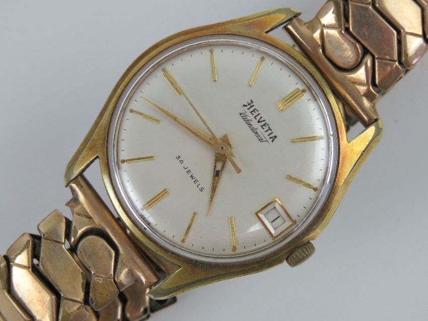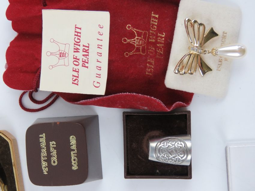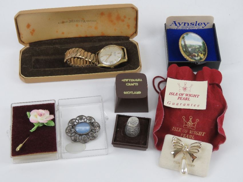 A vintage Helvetia wristwatch on 9ct rolled gold strap with box. Together with a Celtic design pewter Mill Crafts box, an Ainsley ceramic brooch in box, a Royale Stratford fine bone China floral pin in box, an Isle of Wight pearl brooch with pouch and another contemporary brooch. Six items.