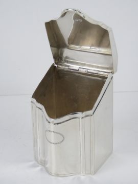 An Art Deco HM silver tea caddy in the shape of a Georgian knife box, hallmarked Sheffield 1924 with maker's mark for Thomas Bradbury & Sons, lid slightly springy, dent noted to middle front edge, standing 9.5cm high, 5.94ozt / 185g.