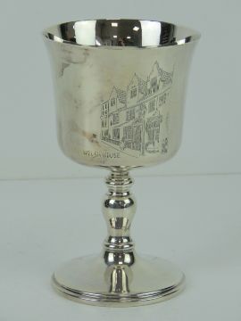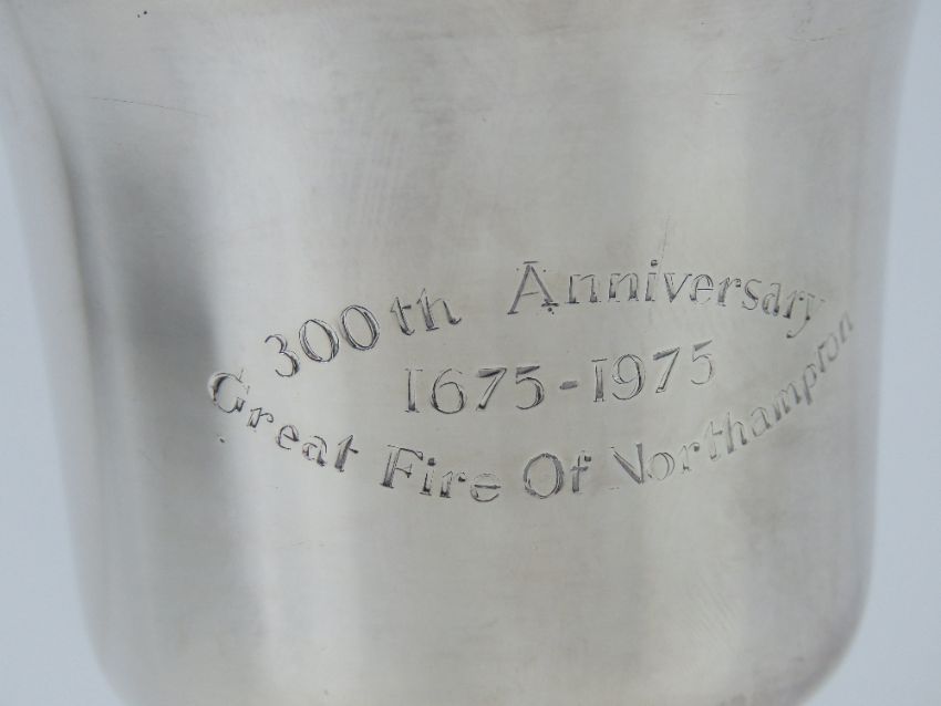 An HM silver chalice commemorating The 300th Anniversary of the Great Fire of Northampton (1675-1975) having engraved image of Welsh House upon. In original box together with 'A Contemporary Account of the FIre of Northampton 1675'. Hallmarked London 1975, Limited Edition no 35/1000, standing 12cm high, 5.76ozt / 178g.