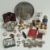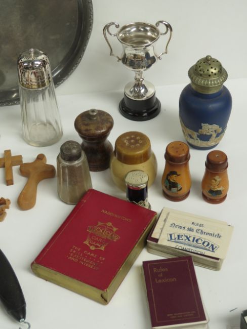 A quantity of assorted oddments inc various salts and peppers, trophy cup, crucifixes, napkin rings, etc together with a large quantity of crowns.