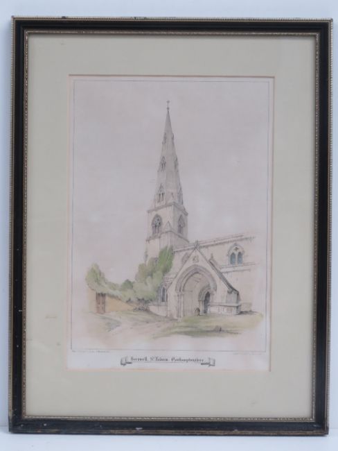 Print; St Andrews Church Barnwell, Northamptonshire, hand tinted, in Hogarth frame, 48 x 37cm.