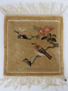 A hand knotted miniature carpet panel having bird and tree blossom upon, 32 x 30cm.