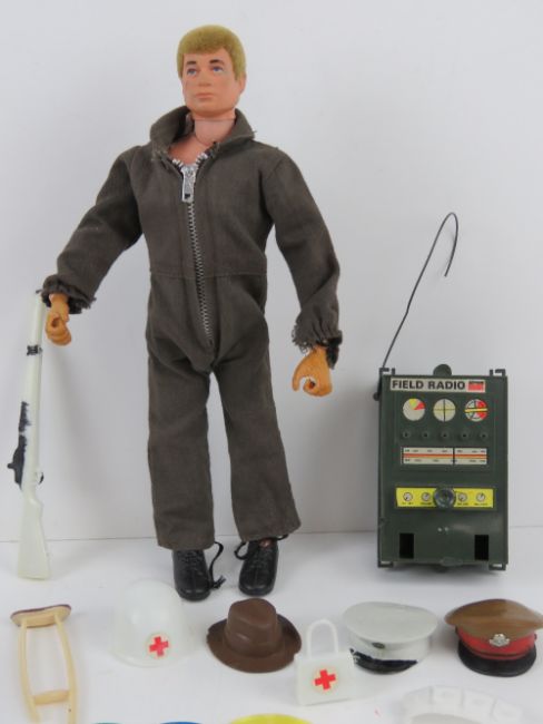 A vintage Action Man made by Palitoy with assorted accessories including; jacket, trousers, hats, field radio etc.
