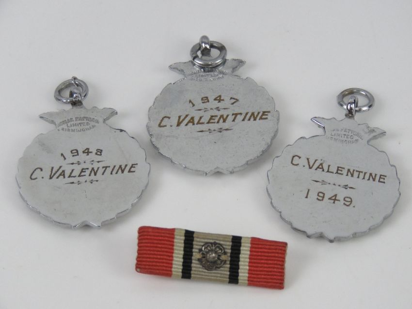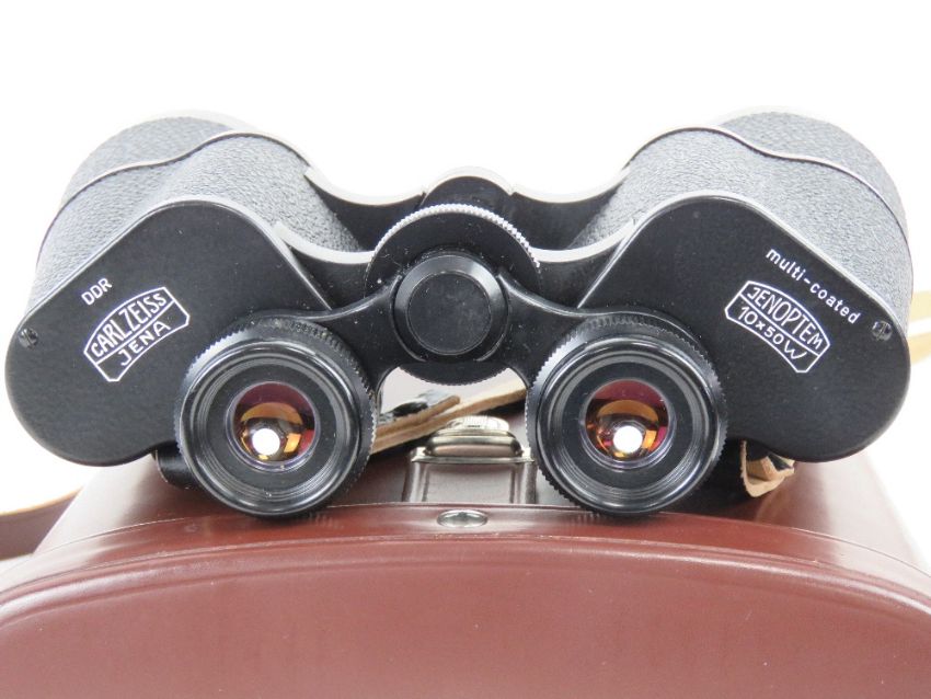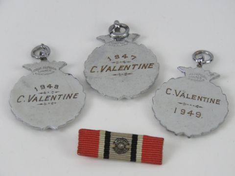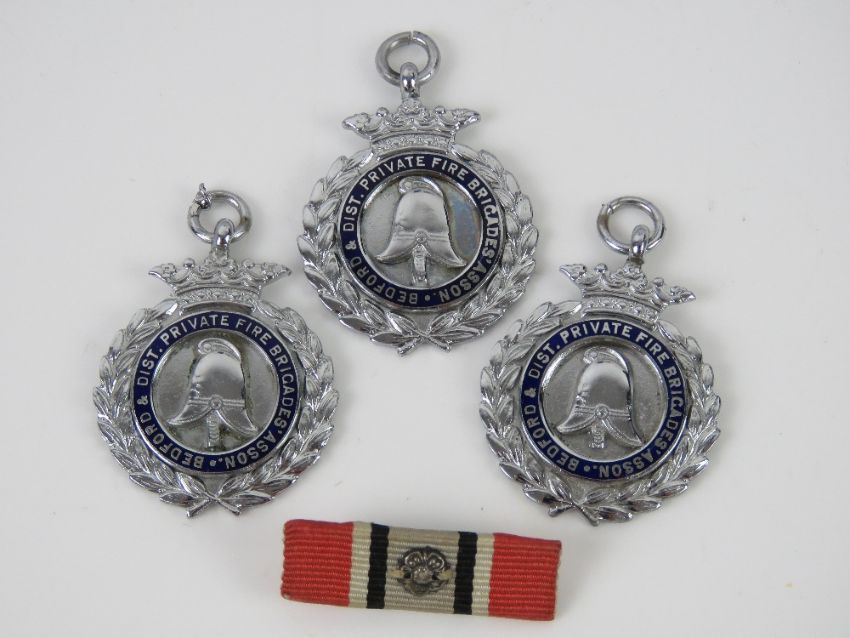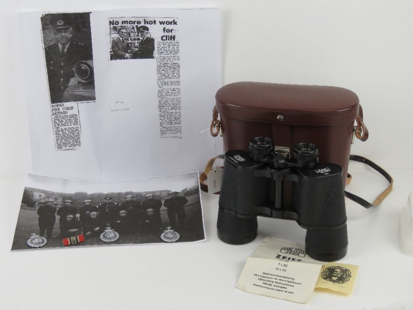 A pair of Zeiss Jenoptem 6816042 10 x 50 W binoculars in original case having been presented to Fire Brigade Chief at Wolverton Works Mr Cliff Valentine upon his retirement in 1974. Together with copy newspaper articles announcing his retirement, three enamelled Bedford & Dist Private Fire Brigades Asson medals engraved for C Valentine (dated 1947-1949) and medal bar.Footnote: Mr Cliff Valentine joined the brigade in 1934 when it was responsible for the safety of the Wolverton area until after WWII.