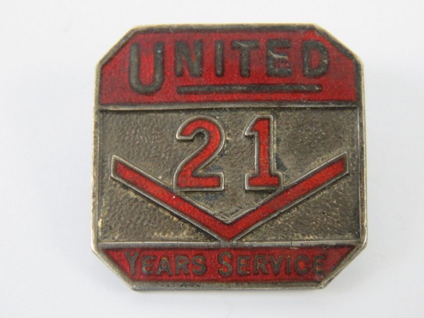 A HM silver United Automobile Services badge having red enamel for '21 Years Service' No 953, hallmarked for Birmingham.