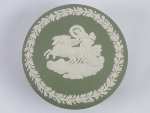 A HM silver and Wedgwood blue Jasperware pendant on silver chain, in original box. Together with a Wedgwood Jasperware thimble in original box and a Wedgwood Jasperware trinket in original box. Three items.